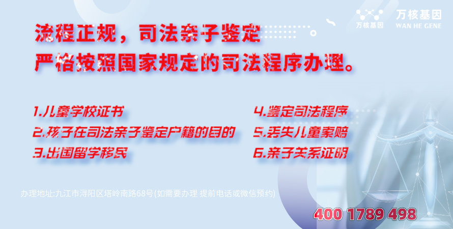 九江浔阳司法dna亲子鉴定哪个地方可以做?九江浔阳亲子鉴定基因检测中心是一家专为九江浔阳地区服务的亲子鉴定咨询机构,九江浔阳司法dna亲子鉴定办理地址:九江市浔阳区塔岭南路68号(如需要办理 提前电话或微信预约)-预约电话:4001789498,九江浔阳亲子鉴定基因检测中心合作全国多家权威司法鉴定所,具有国家颁发的法医物证司法鉴定资质,可以出具九江浔阳司法dna亲子鉴定报告,且出具的司法dna亲子鉴定报告可用于上户口、移民、留学、打官司等,并且全国通用。